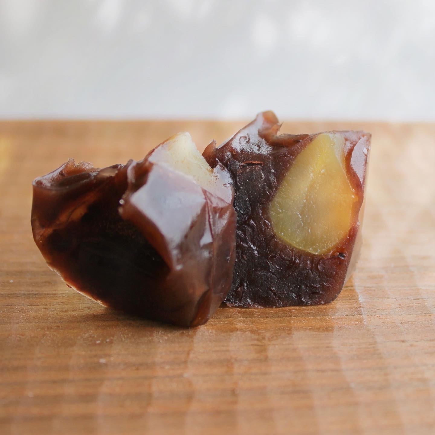 大粒の栗をごろん!といれ、あっさりとした甘みの粒餡があとひく美味しさの生菓子です。