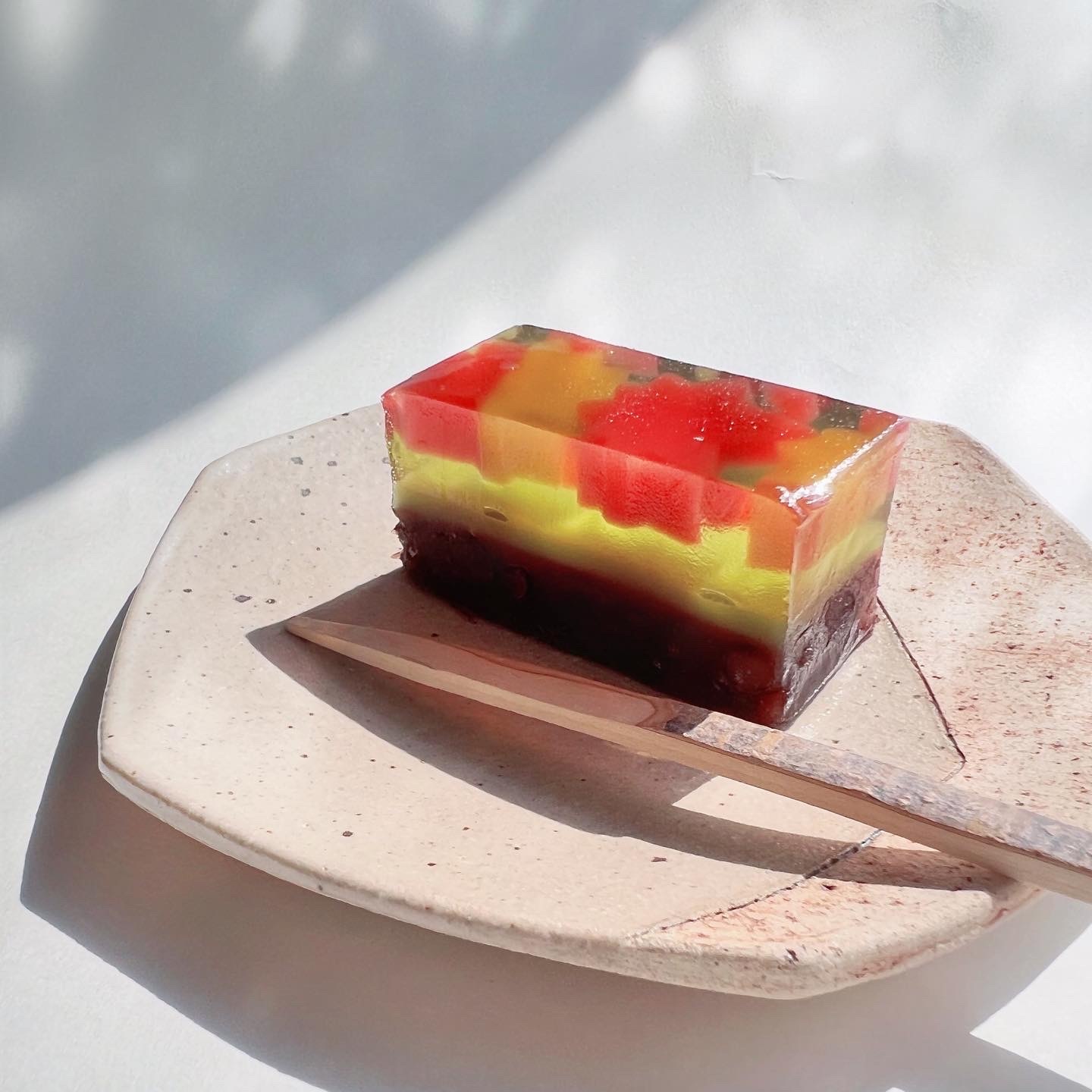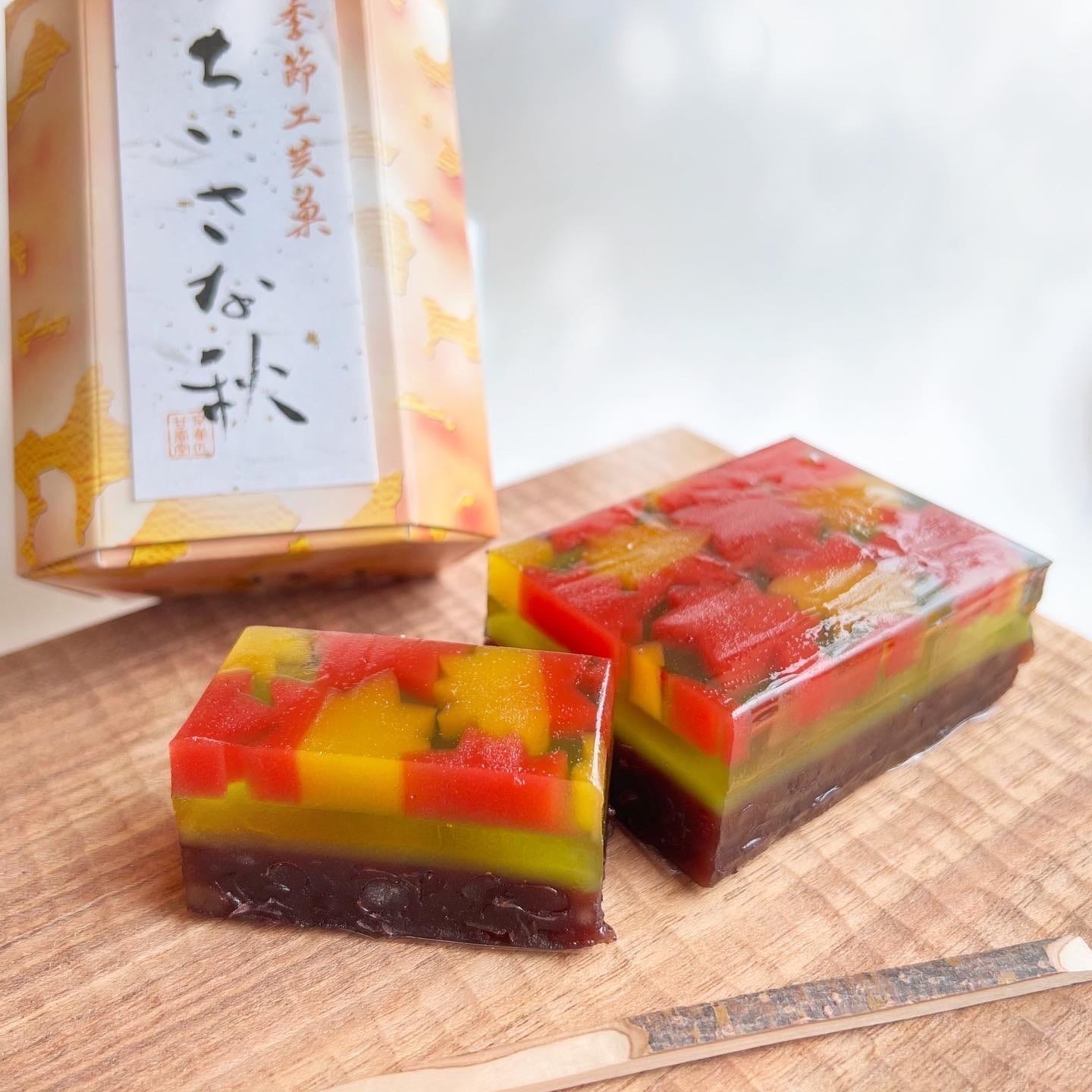 上質の丹波大納言小豆を原料にした粒あんをベースに、淡いグリーンの羊羹ときらめく琥珀羹で、美しい紅葉を閉じ込めました。