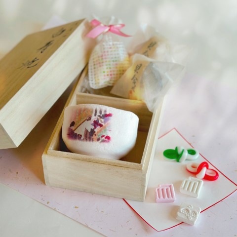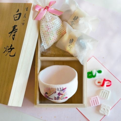 …当店代表銘菓の一つ、お菓子でできた煎茶碗です。数回お茶を入れてご使用頂いたあと、お茶碗を割ってお干菓子としてお召し上がりください。お干菓子が数種類付いています。※お干菓子は写真と異なることがございます。