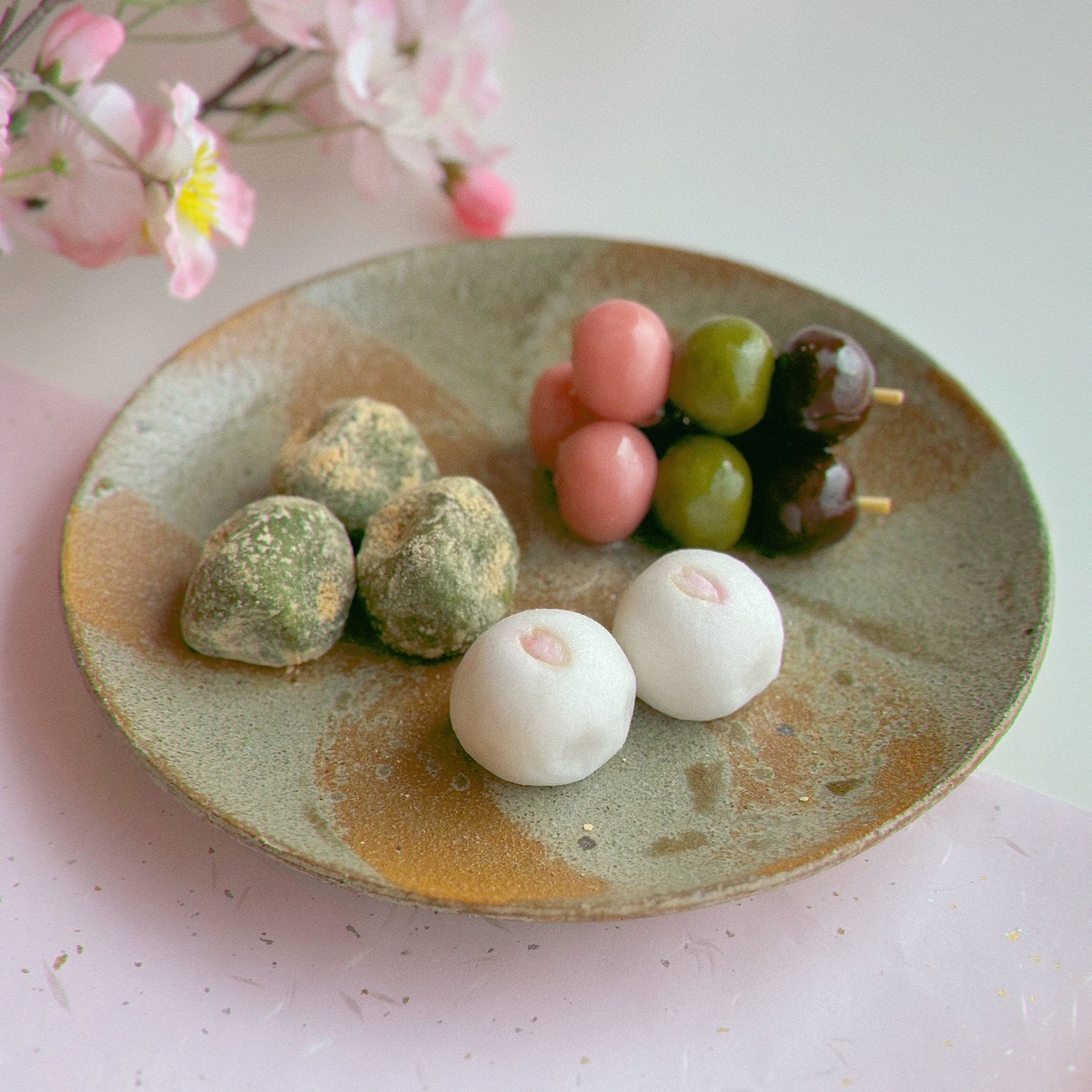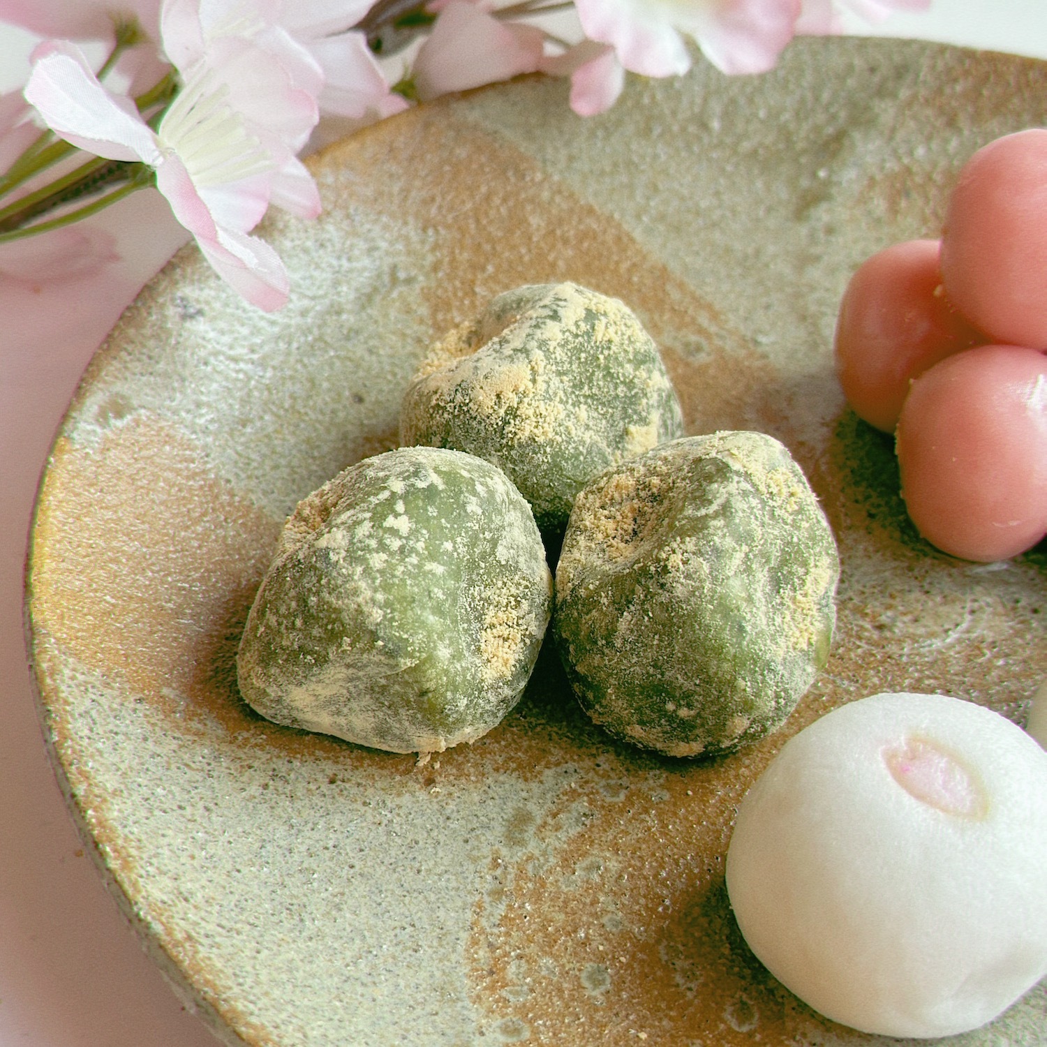 「花さそう」3個・・・・練切餡と抹茶餡と黒砂糖餡で出来ております。