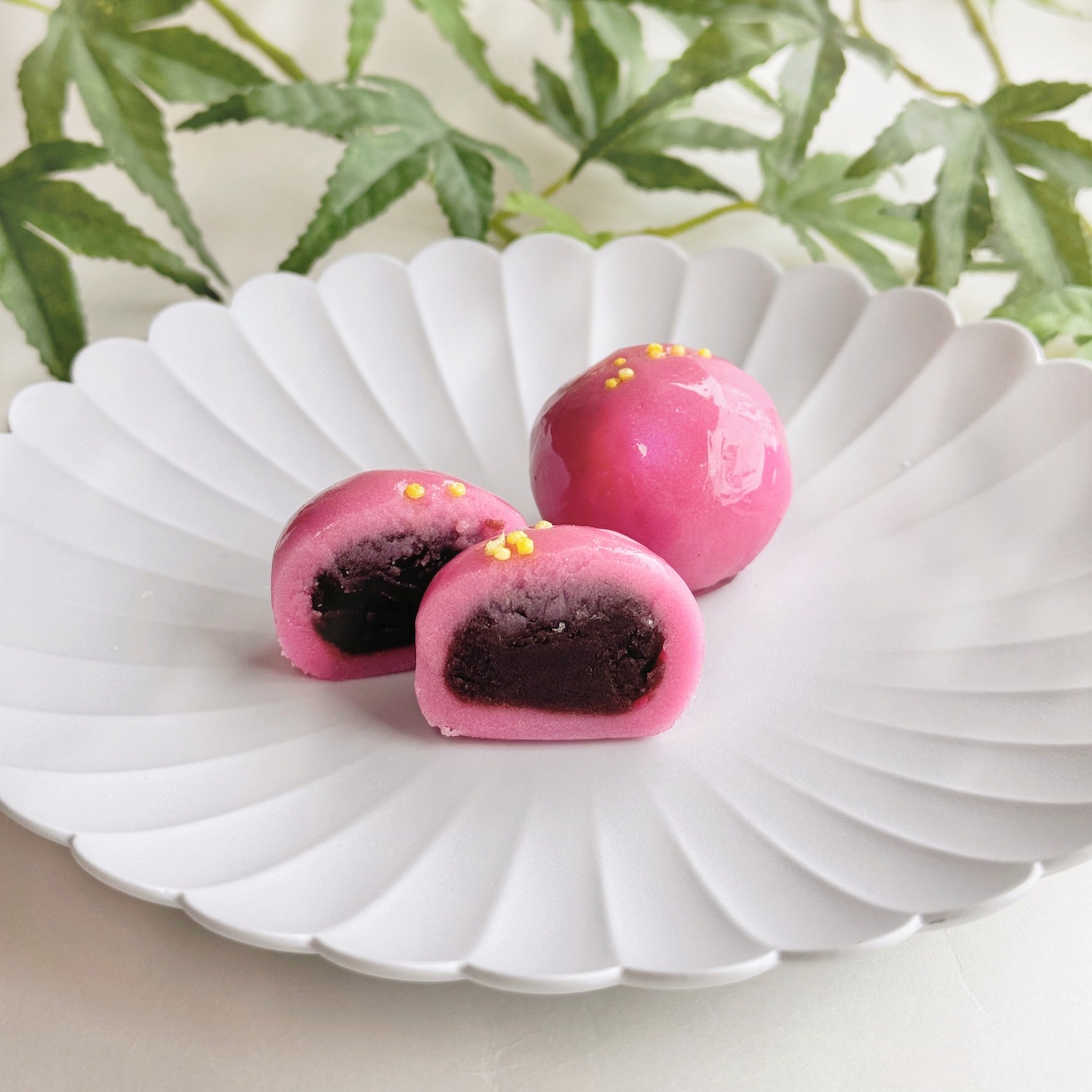 ●「花うらない(黒糖あん)」…5月〜6月ごろに咲く「石竹(セキチク)」をイメージしたお菓子です。鮮やかなピンク色の黒糖あんの練り切りです。