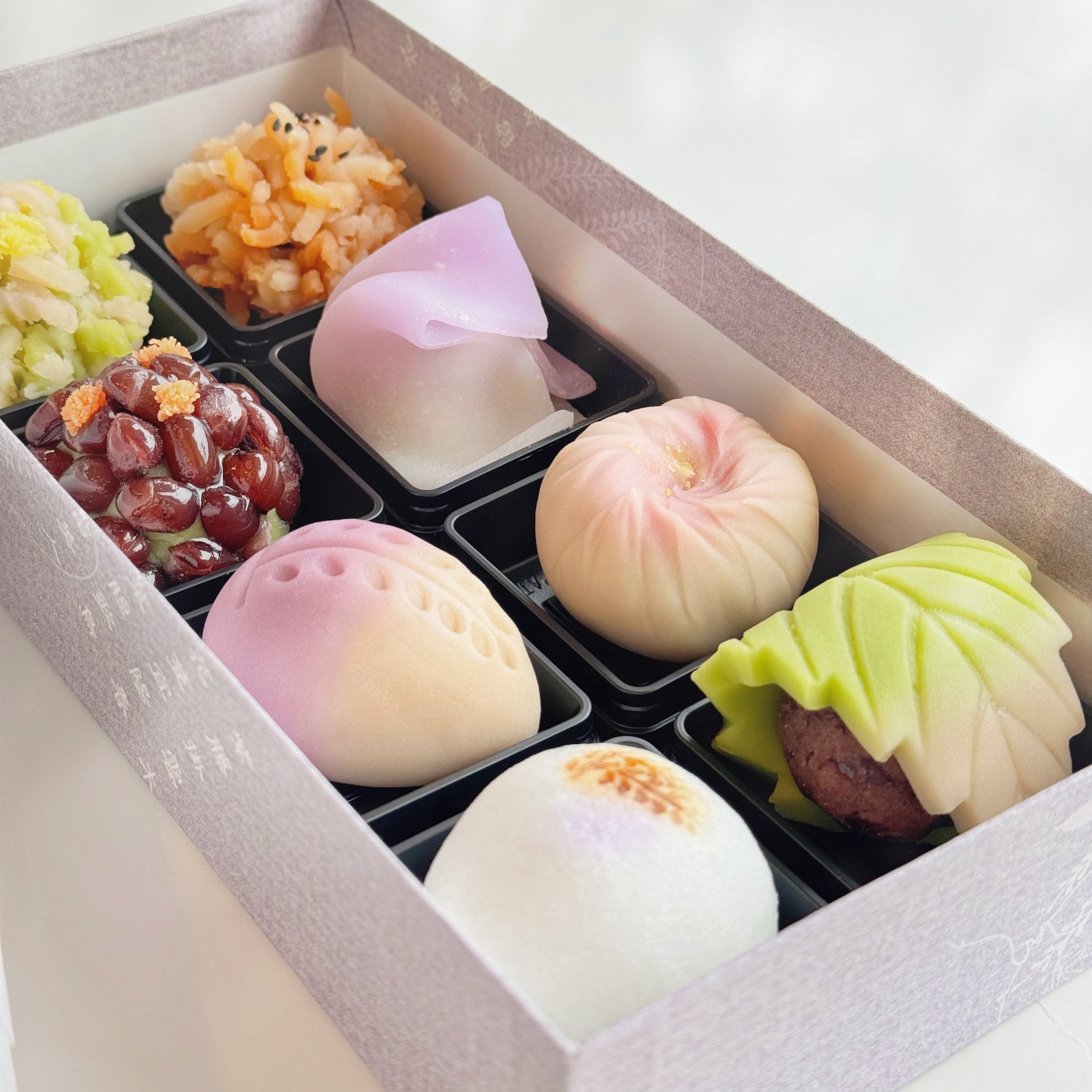 5月の上生菓子全種を化粧箱にお詰めしております。