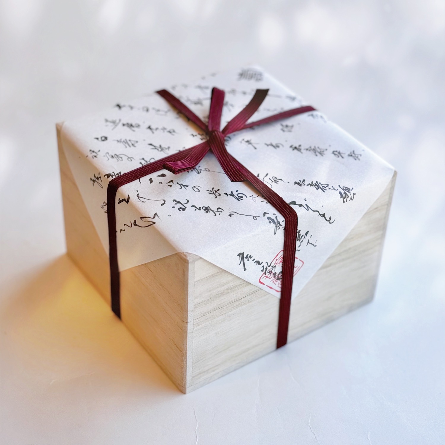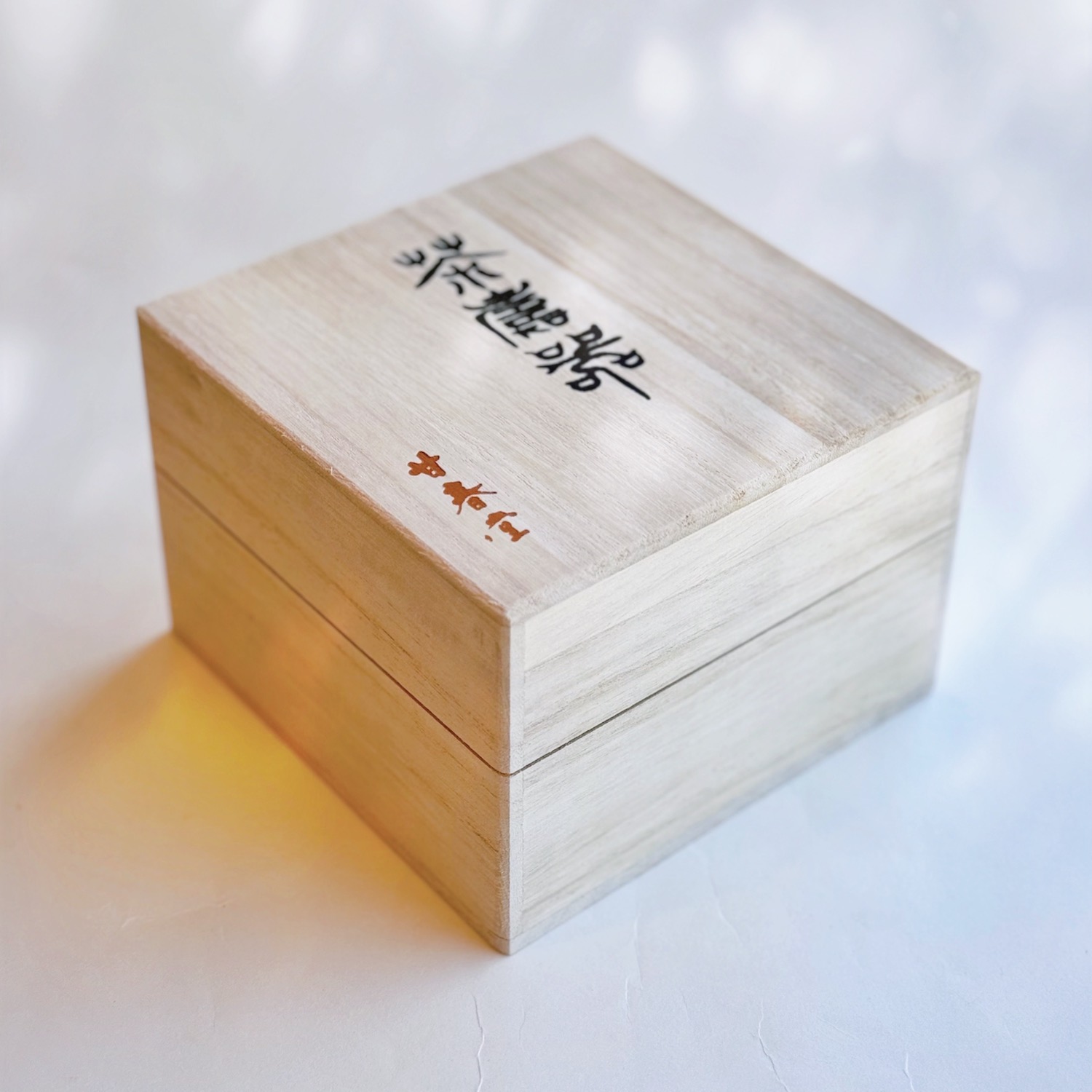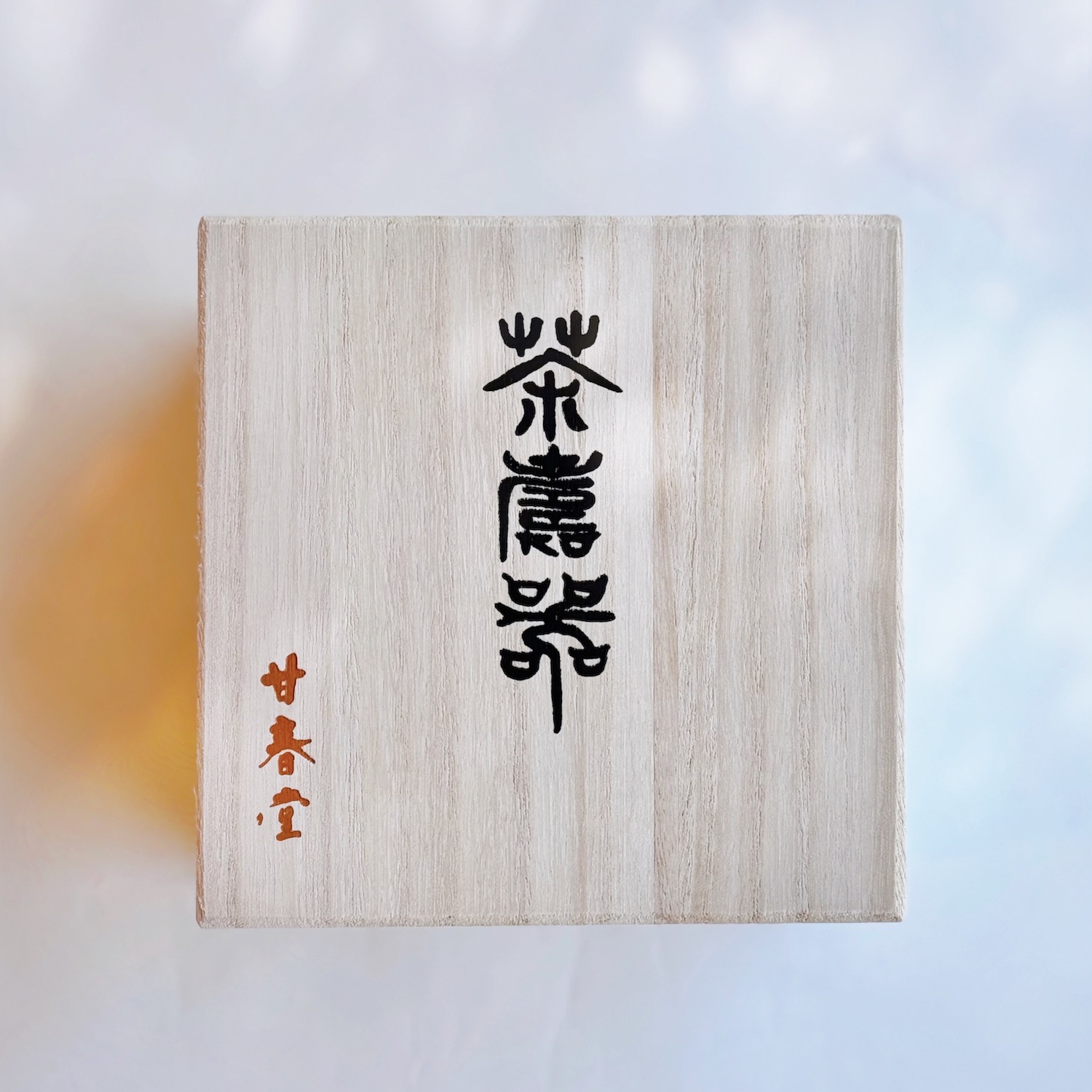 甘春堂の代表銘菓の一つ「茶寿器(ちゃじゅのうつわ)」の桐箱入です。お干菓子は季節により中身が変わります。