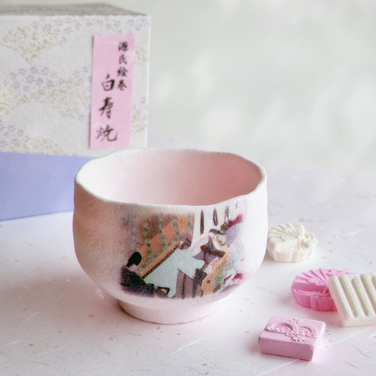 源氏物語の千年紀を記念して、国宝『源氏物語絵巻』<御法(みのり)>の、光源氏が二条院の紫の上を見舞う場面を特殊製法にて絵付した器です。
