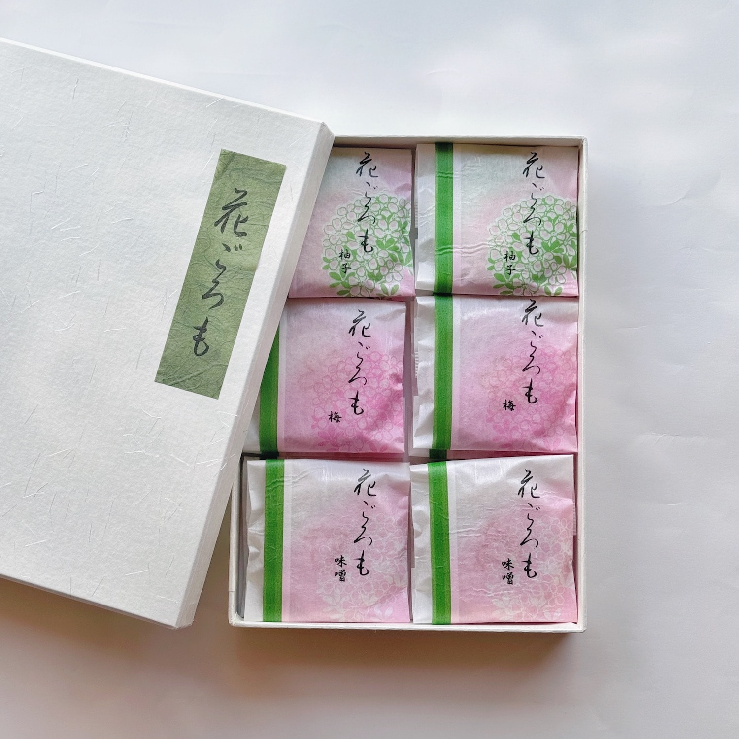 お茶菓子「花ごろも」は、昔ながらの製法による麩焼き煎餅を二枚に切り分け、柚子餡、梅餡、白味噌餡をはさんでおります。