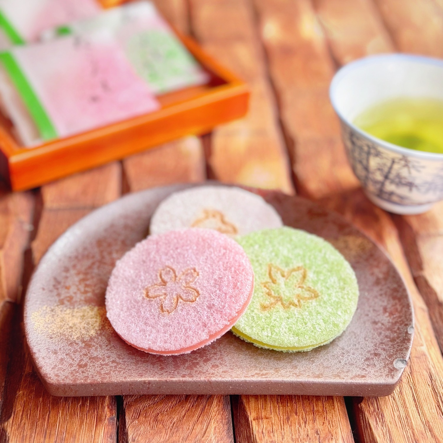 お茶菓子「花ごろも」は、昔ながらの製法による麩焼き煎餅を二枚に切り分け、柚子餡、梅餡、白味噌餡をはさんでおります。